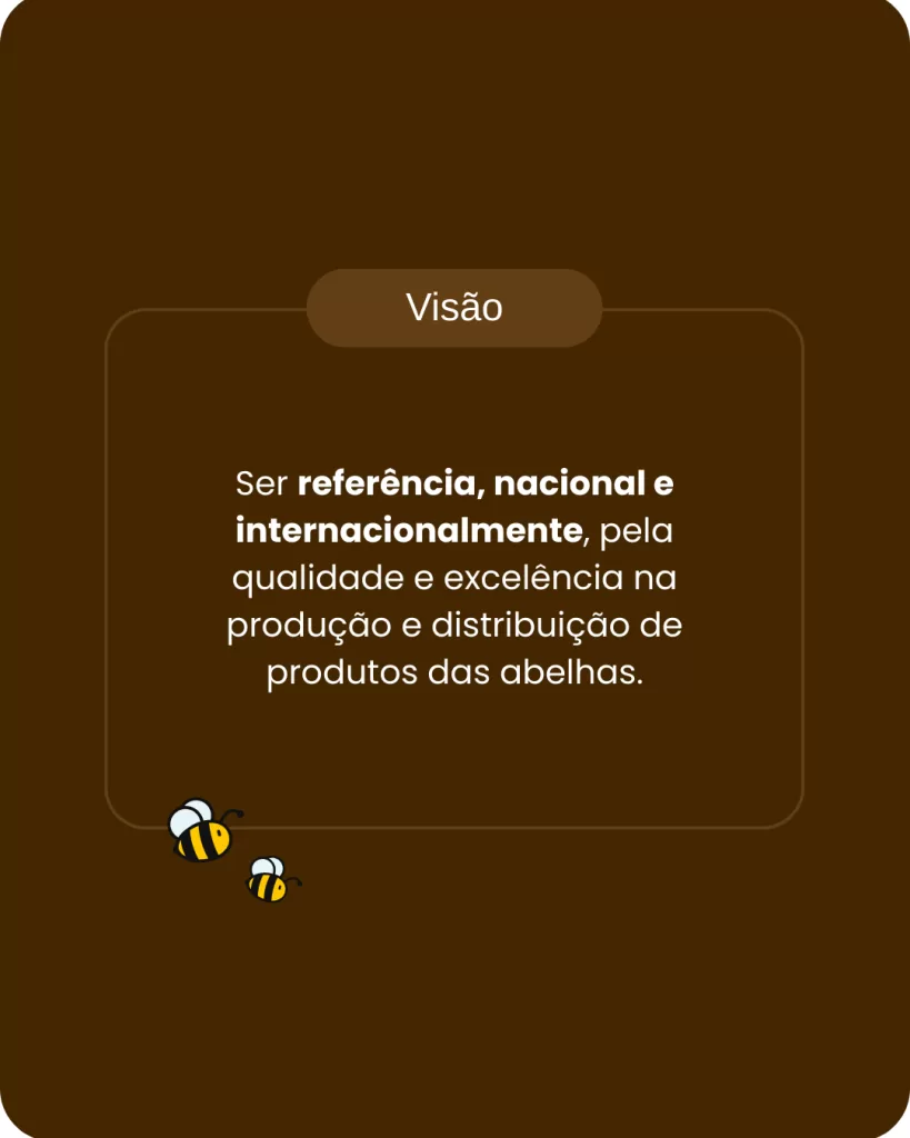 🌍 Nossa visão é ser referência no Brasil e no mundo pela excelência na produção e distribuição de produtos das abelhas — sempre com ética, transparência e respeito às pessoas e à natureza.